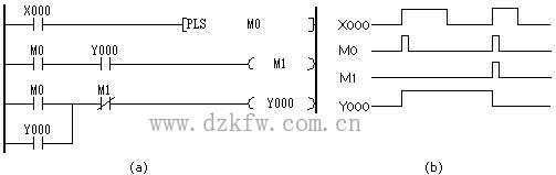 (4)输入设备多功能化  在传统的继电控制系统中,一个主令(按钮、开关等)只产生一种功能的信号。在PLC控制系统中,一个输入设备在不同的条件下可产生不同的信号,如一个按钮既可用来产生启动信号,又可用来产生停止信号。如图4所示,只用一个按钮通过X000去控制Y000的“通”与“断”。即第一次接通X000时Y000“通”再次接通X000时Y000“断”。