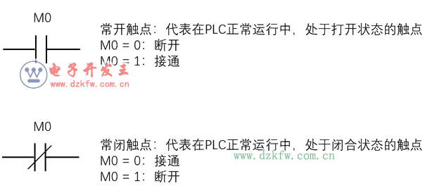 M是最常用的辅助继电器,其只有OFF(0)和ON(1)两种状态,和通常我们接触到的中间继电器一样,在梯形图中,又分为常开触点和常闭触点