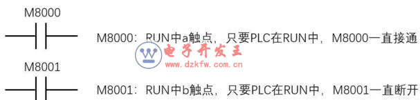 M8000是一直接通(ON)的,M8001是一直闭合(OFF)的