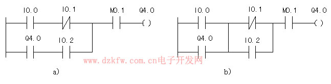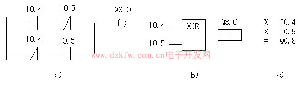 如果两个触头刚好组成示的控制线路,则形成了逻辑异或关系。相应的异或指令XOR重要性不如前述五条指令,虽然XOR指令使用时可以提供一些便利,但其逻辑结果用前述五条指令的组合也可实现。
