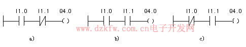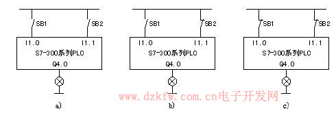 例: S7-300输入端口上接入的控制按钮类型各不相同,图a)的I1.0与I1.1端口均接入常开按钮SB1、SB2,图b)的I1.0端口接入常开按钮SB1、I1.1端口接入常闭按钮SB2,图7-21c)的I1.0与I1.1 端口均接入常闭按钮SB1、SB2。