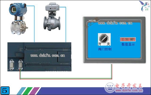 图4要实现的功能是,触摸屏和西门子S7-200PLC连接,1,在触摸屏上可以显示PLC里的一个压力数值,。2,可以通过触摸屏上的一个开关部件,控制PLC里的一个开关量。