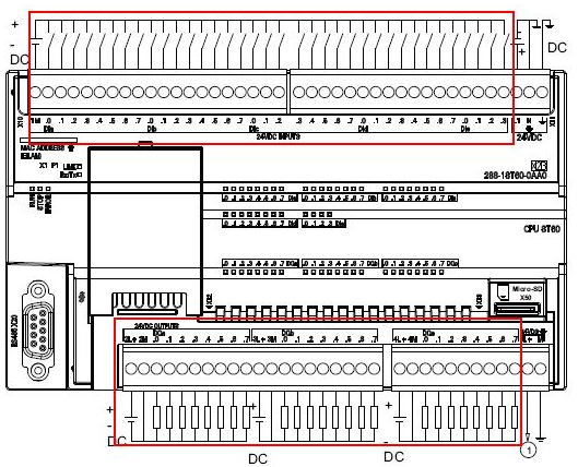 (1) 模块缺少24V直流供电电源; I/O扩展模块缺少24V直流供电电源时,所有通道指示灯也以红色闪烁。建议核对模块接线图,尤其是模块供电端含两排端子的,确定供电接线是否正确,以EM DR32为例,正确的接线方式如下图所示。