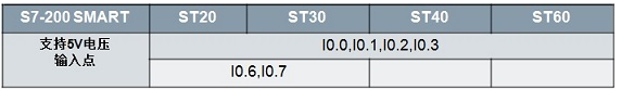 对于大多数输入来讲,都是24VDC输入,其中ST CPU的 I0.0-I0.3 支持 5-24V 输入,另外ST20/30 的I0.6、I0.7也支持5-24V输入。如下表所示: