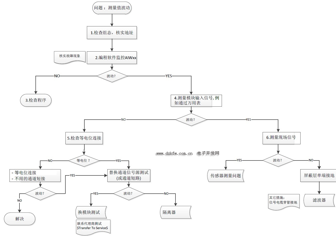 当 S7-200 SMART模拟量输入模块接收到测量值波动时,可通过如下图的步骤进行检查: