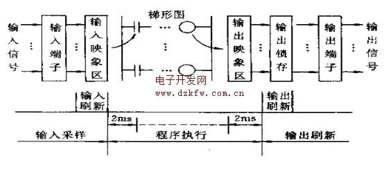 当PLC投入运行后,其工作过程一般分为三个阶段,即输入采样、用户程序执行和输出刷新三个阶段。完成上述三个阶段称作一个扫描周期。在整个运行期间,PLC的CPU以一定的扫描速度重复执行上述三个阶段。