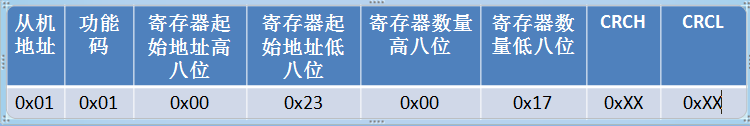 假设从机地址位0x01,寄存器开始地址0x0023,寄存器结束抵制0x0038,总共读取21个线圈。协议图如下: