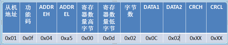 1)描述:写多个线圈寄存器。若数据区的某位值为“1”表示被请求的相应线圈状态为ON,若某位值为“0”,则为状态为OFF。