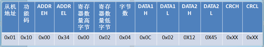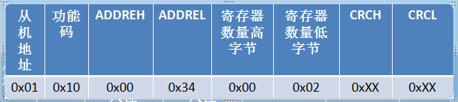 保持寄存器起始地址为0x0034,写2个寄存器4个字节的数据;