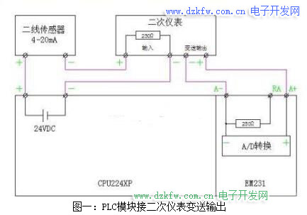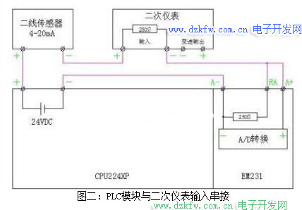 (图一、图二):PLC的24VDC正极接传感器的输出V+,传感器的输出V-接二次仪表的输入+,二次仪表的输入-并接EM235的A+与RA二端点,EM231的A-接PLC的24V电源负极。