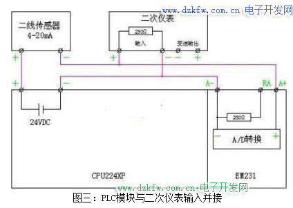 (图三):PLC的24VDC正极接传感器的输出V+,传感器的输出V-接二次仪表的输入+和EM231的输入A+,二次仪表的输入-和EM231的A-接在一起,再接24V的负极,即二次仪表的输入与EM231的输入是并联连接的。