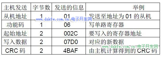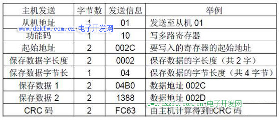 例如:主机要把数据07D0,保存到地址为002C的从机寄存器中去(从机地址码为01)。通讯数据保存结束后,地址为002C的PDM表原存储信息为: