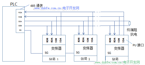 2、多台变频器与PLC的RS-485通信连接