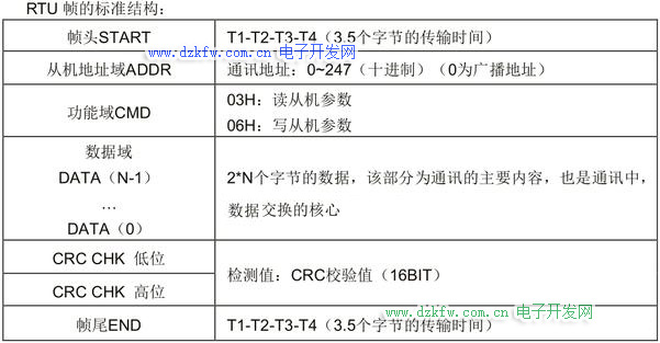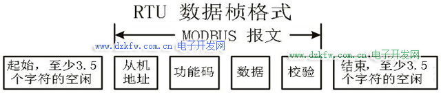 在 RTU 模式中,新帧总是以至少 3.5 个字节的传输时间静默作为开始。在以波特率计算传输速率的网络上,3.5 个字节的传输时间可以轻松把握。紧接着传输的数据域依次为:从机地址、操作命令码、数据和 CRC 校验字,每个域传输字节都是十六进制的 0…9,A…F。网络设备始终监视着通讯总线的活动。当接收到第一个域(地址信息),每个网络设备都对该字节进行确认。随着最后一个字节的传输完成,又有一段类似的 3.5 个字节的传输时间间隔,用来表识本帧的结束,在此以后,将开始一个新帧的传送。