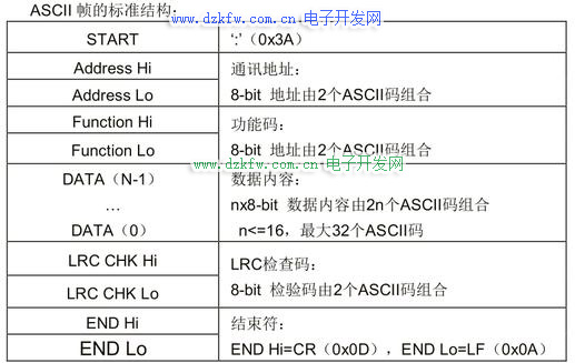 在 ASCII 模式中,帧头为“:”(“0x3A”),帧尾缺省为“CRLF”(“0x0D”“0x0A”)。在 ASCII 方式下,除了帧头和帧尾之外,其余的数据字节全部以 ASCII 码方式发送,先发送高 4 位位元组,然后发送低 4位位元组。ASCII 方式下数据为 8 位长度。对于‘A’~‘F’,采用其大写字母的 ASCII 码。此时数据采用 LRC校验,校验涵盖从从机地址到数据的信息部分。校验和等于所有参与校验数据的字符和(舍弃进位位)的补码。