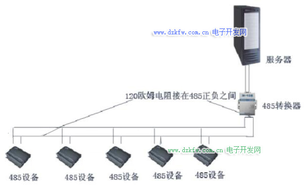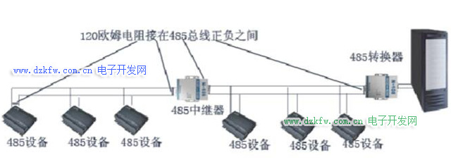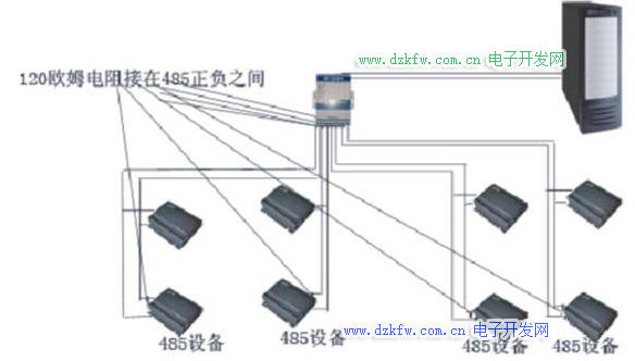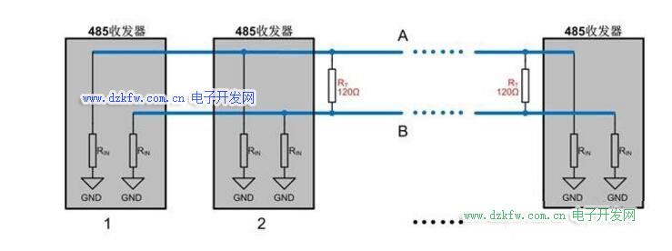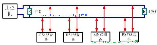一般终端匹配采用终端电阻方法, RS-485应在总线电缆的开始和末端都并接终端电阻。终接电阻在RS-485网络中取120Ω。相当于电缆特性阻抗的电阻,因为大多数双绞线电缆特性阻抗大约在100~120Ω。这种匹配方法简单有效,但有一个缺点,匹配电阻要消耗较大功率,对于功耗限制比较严格的系统不太适合。另外一种比较省电的匹配方式是RC匹配。利用一只电容C隔断直流成分可以节省大部分功率。但电容C的取值是个难点,需要在功耗和匹配质量间进行折衷。 还有一种采用二极管的匹配方法,这种方案虽未实现真正的“匹配”,但它利用二极管的钳位作用能迅速削弱反射信号,达到改善信号质量的目的,节能效果显著。