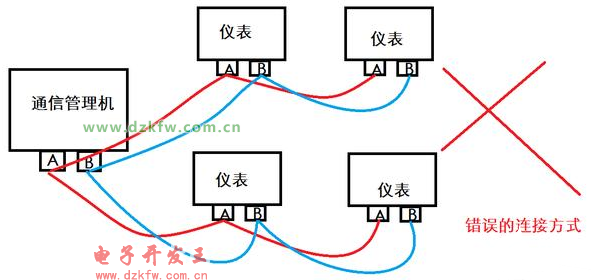 RS485总线要采用上图手拉手式的总线结构,坚决杜绝星型连接和分叉连接,如下图: