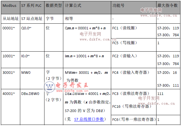 S7 PLC手册给出的Modbus地址与Modicon公司和GE公司PLC使用的地址相同,是基于1的地址,即同类元件的首地址为1。而西门子PLC采用的是基于0的地址,即同类元件的首地址为0。Modbus报文中西门子PLC的Modbus地址也采用基于0的地址。