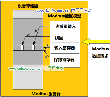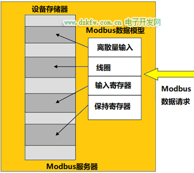 数据模型是对可访问数据的一种抽象,Modbus协议的数据模型定义了四种可访问的数据,分别是: