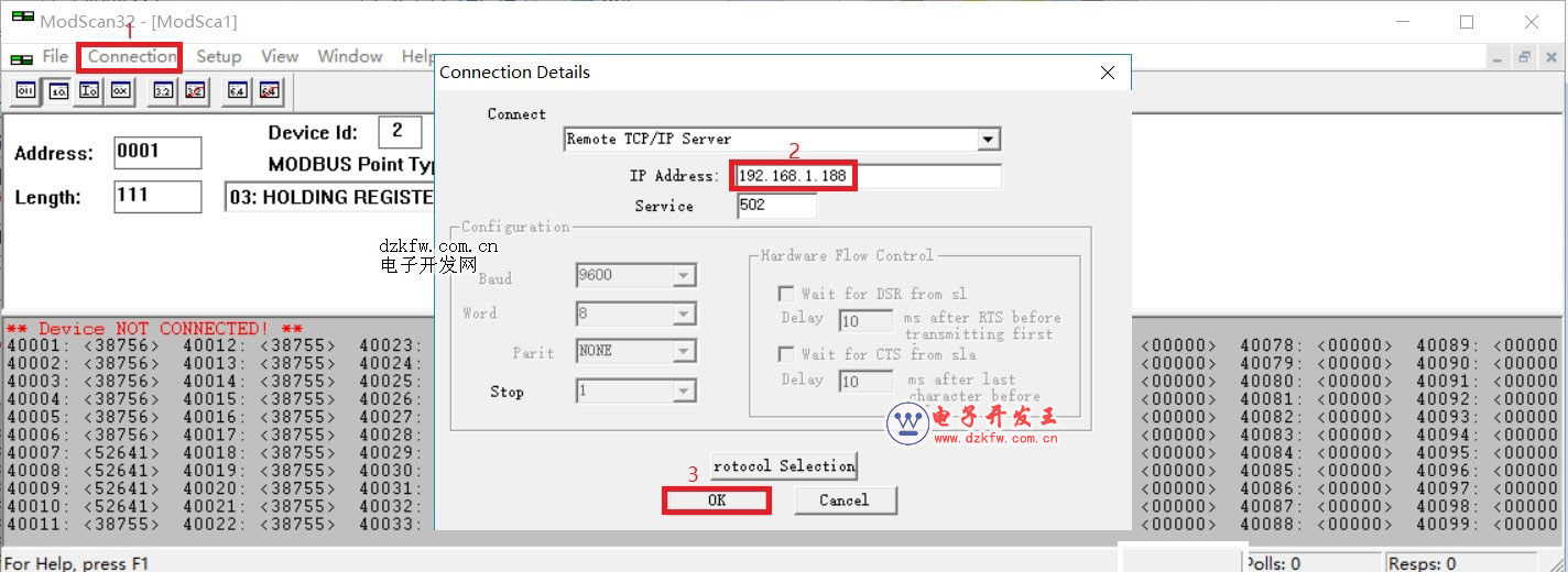 选择菜单栏【Connection】--Connect,在对话框中的【IP Address】处输入协议转换网关的IP地址,点击【OK】按钮;