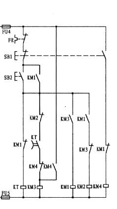 PLC没有断电延时型定时器,只有通电延时型定时器。本梯形图的工作原理:当外接启动按钮SB2按下,驱动第一梯级X000的常开接点闭合,通过串接其后的X001、T1、T0、Y002的常闭接点,接通输出继电器,由于Y000线圈的闭合,促使第一梯级第一支路中的并联常开触点闭合形成Y000线圈自保,至使Y000驱动的接触器KM3闭合将电动机绕组接成星形。在这同时,第二梯级中的左母线一侧的常开触点Y000闭合,通过串接其后的X001、Y003的常闭接点接通了输出继电器Y001和另一支路经Y002常闭接点相串的定时器线圈T0(K值为40)。由于Y001线圈的闭合使与本支路相并的母线一侧Y001闭合形成了Y001线圈自保。由于Y001线圈的闭合,接于Y001后的外部接触器KM1闭合,电动机处于星接启动状态。在Y001闭合的同时定时器T0也已开始计时,4S后定时器T0常闭接点,在第一梯级中切断了输出继电器Y000线圈,解除了星接。而在这同时,第三梯级中左母线一侧的T0 常开接点闭合,通过串接其后的X001、Y000的常闭接点,接通了输出继电器Y002。由于Y002的接通,并接于左母线一侧的Y002闭合,使Y002线圈形成自保。Y002线圈后所接的接触器KM2接通,完成了星角转换,使电动机进入了角接状态。第一梯级中与第三梯级中所串接的Y002和Y001常闭接点实质是星与角的互锁。停止按外接停止按钮SB1,从梯形图中可以看出由SB1驱动的第一梯级、第二梯级和第三梯级均串接了X001的常闭触点,其目的是让电动机在任一运行状态,均能可靠停止。而在第四梯级X001接的是常开触点,其一旦闭合,通过串接其后的定时器常闭接点,接通了输出继电器Y003线圈和定时器T1线圈,由于Y003线圈的闭合,其并接于第一梯级第二支路中的Y003常开接点接通了Y000线圈,驱动KM3闭合,使电动机的处于星接状态,以提供直流通道。在线圈Y003闭合后,驱动了外接接触器KM4在电动机停止交流供电的情况下向电动机提供直流电进行能耗制动。定时器线圈T1是与线圈Y003同时获电,并开始计时,计时时间一到,串接于第一梯级与第四梯级的常闭接点断开,使电动机完成了停车与制动的过程。外部接触器接线时,应考虑接触器间的互相联锁以防短路。另本梯形图没设置热保护。