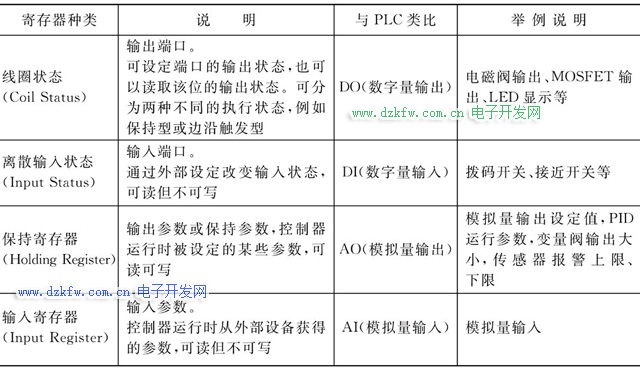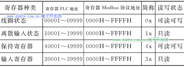 Modbus协议中一个重要的概念是寄存器,所有的数据均存放于寄存器中。最初Modbus协议借鉴了PLC中寄存器的含义,但是随着Modbus协议的广泛应用,寄存器的概念进一步泛化,不再是指具体的物理寄存器,也可能是一块内存区域。Modbus寄存器根据存放的数据类型以及各自读写特性,将寄存器分为4个部分,这4个部分可以连续也可以不连续,由开发者决定。