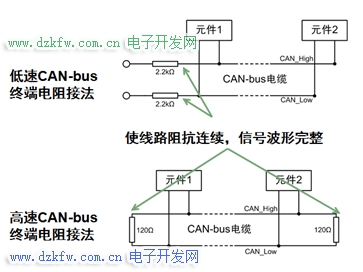 高速CAN总线最高信号传输速率为1Mbps,支持最长距离40m。ISO11898-2要求在高速CAN总线两段安装端接电阻RL(端接电阻一般为120Ω,因为电缆的特性阻抗为120 Ω,为了模拟无限远的传输线。)以消除反射。低速CAN最高速度只有125Kbps,所以ISO11898-3没有端接要求。