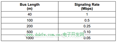 因为传输距离越大,信号时延也越大,为了保证消息的正确采样,总线上的信号速率相应也要下降。下图是推荐的信号速率与距离的关系。
