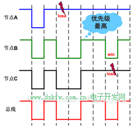 CAN总线遵从“线与”机制:“显性”位可以覆 盖“隐性”位;只有所有节点都发 送“隐性”位, 总线才处于“隐性” 状态。这种“线与”机制使CAN总线呈现显性优先的特性。