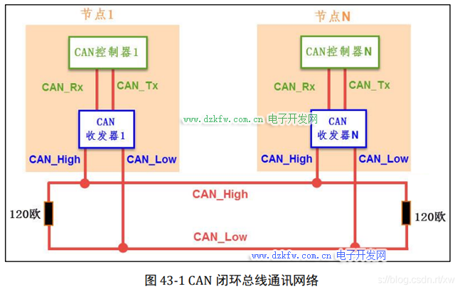 在发送数据时,CAN控制器把要发送的二进制编码通过CAN_Tx线发送到CAN收发器,然后由收发器把这个普通的逻辑电平信号转化成差分信号,通过差分线CAN_High和CAN_Low输出到CAN总线网络。接收数据过程,相反。采用差分信号,可以取得更好的电磁兼容效果。因此,CAN总线物理传输媒介只需要两根线。