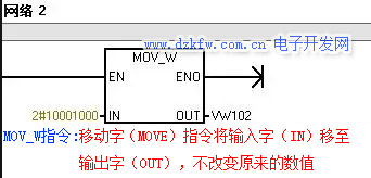 2.1 MOV_W指令。移动字(MOVE)指令将输入字(IN)移至输出字(OUT),不改变原来的数值