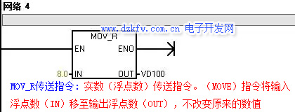 4.1 实数(浮点数)传送指令。(MOVE)指令将输入浮点数(IN)移至输出浮点数(OUT),不改变原来的数值