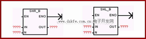SLB和SRB,字节左移和字节右移。使能输入有效时,把字节型输入数据IN左移或右移N位后,再将结果输出到OUT所指的字节存储单元。最大实际可移位次数为8。