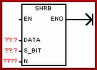 SHRB,寄存器移位指令:该指令在梯形图中有3个数据输入端:DATA为数值输入, 将该位的值移入移位寄存器;S_BIT为移位寄存器的最低位端;N指定移位寄存器的长度。每次使能输入有效时,整个移位寄存器移动1位。
