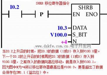 就是当I0.2上升沿的时候,把I0.3的数据(1或0)存入到V100.0里。下一个I0.2的上升沿的时候再把I0.3的数据(1或0)存入到V100.0里,之前存入的数据向高位移动,就是存入到V100.1,因为图中N为+4所以移位寄存器最高位是V100.3,要是超出了数据会保存在SM1.1(溢出位)中。当N为负值的时候就是高位保存,向低位移位。