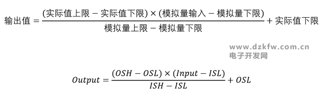 模拟量计算子程序,主要是将一个范围的值对应到另个范围中的值。程序代码中应用的公式如下图所示。