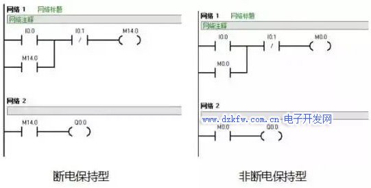 2、断电保持型中间继电器(M14.0~M31.7),在PLC电源中断后,它具有保持断电前的瞬间状态的功能,并在恢复供电后继续断电前的状态。
