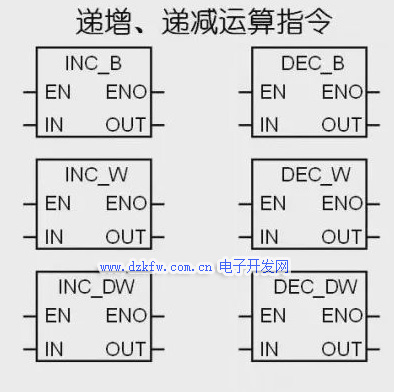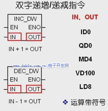 双字递增、递减指令将输入双字IN加一或者减一,并将运算结果送到OUT中,其操作数为三十二位有符号双整数,需要注意双字递增、递减运算带符号。