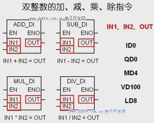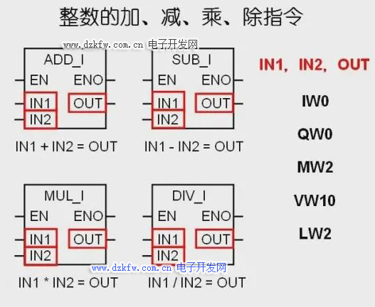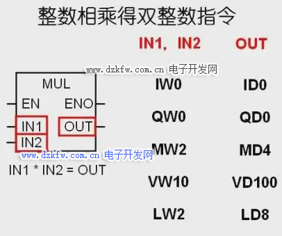 当两个十六位整数相乘,所得的结果可能溢出十六位整数范围时,可以使用整数相乘得双整数指令,它将两个十六位整数IN1和IN2相乘,从而产生一个三十二位的双整数结果。
