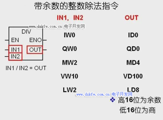 带余数的整数除法指令,将两个十六位的整数IN1和IN2相除从而产生一个三十二位的结果,其中操作数IN1和IN2是十六位有符号整数,三十二位的结果OUT中,高十六位为余数,低十六位为商。