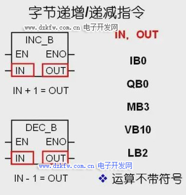 字节递增、递减指令将输入字节IN加一或者减一,并将运算结果送到OUT中,其操作数为八位无符号数,需要注意字节递增、递减运算不带符号。