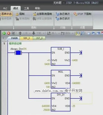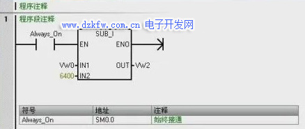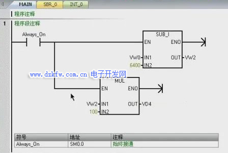 我们来编写程序。双击电脑桌面上的STEP7-Micro/WIN SMART图标,打开编程软件,首先从指令树的位逻辑中选择一个常开触点,拖放到程序编辑器的程序段1中,输入地址SM0.0,在指令树整数计算选项中拖动整数相减指令到刚刚添加的常开触点后面,在IN1处输入地址VW0,在IN2处输入数值6400,在OUT处输入地址VW2。