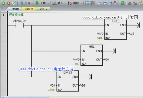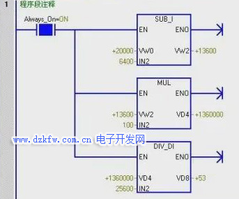 再次单击工具栏插入向下垂直线按钮,继续产生程序分支。因为VD4是双整数,所以需要双整数相除指令,插入该指令,在IN1处输入地址VD4,在IN2处输入数值25600,在OUT处输入地址VD8。这样,一个用整数运算指令编写的模拟量运算程序就编写完成了。