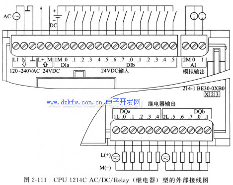 n.可选的仿真器(小开关板)为数字量输入点提供输入信号来测试用户程序。③CPU的技术规范 每种CPU有板有3种具有不同电源电压和输入、输出电压的版本。图2-111是CPU 1214C AC/DC/Relay(继电器)型的外部接线图。输入回路一般使用CPU内置的DC24V电源,此时需要去除外接DC电源,将输出回路的1M端子与24V电源的端子连接起来,将24V电源的L 端子接到外接触点的公共端。