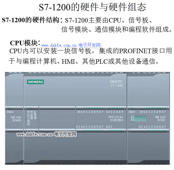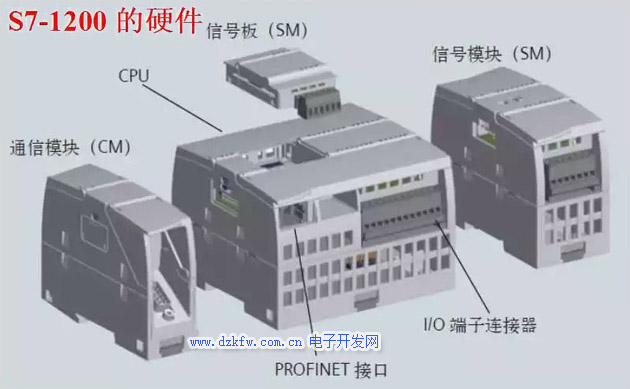 S7-1200 PLC主要由CPU模块(简称CPU)、信号板、信号模块、通信模块和编程软件组成,各种模块安装在标准导轨上。通过CPU模块或通信模块上的通信接口,PLC被连接到通信。