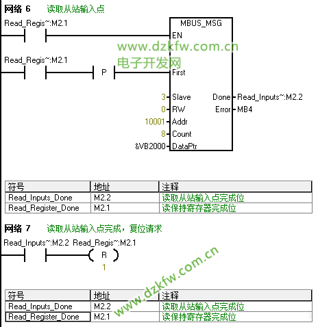 第三步:M0.1置位读取从站数据,读取保持寄存器40001-40008 8个数据根据数据格式写入&VB1000,40001,40002为32位浮点数,则保持在VB1000 VB1001 VB1002 VB1003中,依次类推,读取完成M2.1置位,复位读取从站保持寄存器MO.1 M2.3