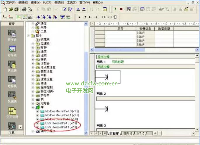 所有的西门子变频器都带有一个RS485通讯口,PLC作为主站,最多允许31个变频器作为通讯连路中的从站,根据各变频器的地址或者采用广播方式,可以访问需要通讯的变频器,只有主站才能发出通讯请求报文,报文中的地址字符指定要传输数据的从站,从站只有在接到主站的请求报文后才可以向从站发送数据,从站之间不能直接进行数据交换。在使用USS协议之前,需要先安装西门子的指令库。USS协议指令在STEP7—MICRO/WIN32指令树的库文件夹中,STEP7—MICRO/WIN32指令库提供14个子程序、3个中断程序和8条指令来支持USS协议。调用一条指令时,将会自动地增加一个或几个子程序。