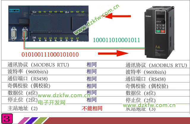 再看图3,是一台PLC和一台变频器通信时,双方需要各自设定的通信参数列表。下面做一下说明。