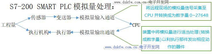 传感器→变送器→PLC模拟量输入通道→PLC运算(或PID控制)→模拟量输出通道→执行器