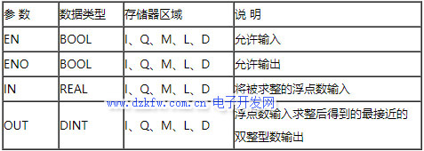 ROUND(实数按4舍5入法则转换为双整型数)指令,读浮点数输入参数IN的内容,并转换成双整型数(32位),转换结果取最接近的双整型数。如果浮点数正好在两个双整型数中间,则取偶双整型数。转换结果由输出参数OUT输出。如果转换出现溢出,则ENO将置成“0”。